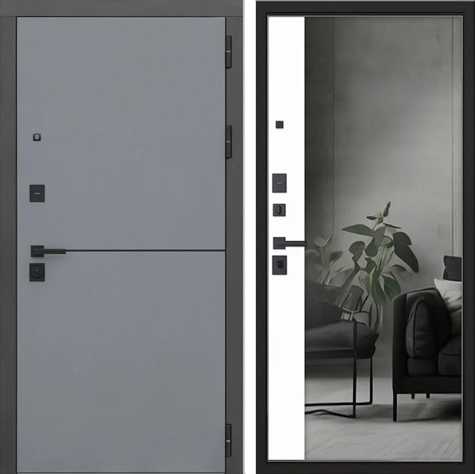 Порошковое покрытие "муар черный". . Экошпонированная панель МДФ 10 мм (цвет «альянс TF 40 IE-X-89U графит»). Декоративный молдинг 10 мм (цвет «черный»). Наличник гладкий МДФ 80 мм (цвет «черный кварц»).